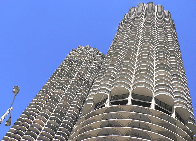 The ‘corncob’ building, and…deep dish pizza? Maybe?