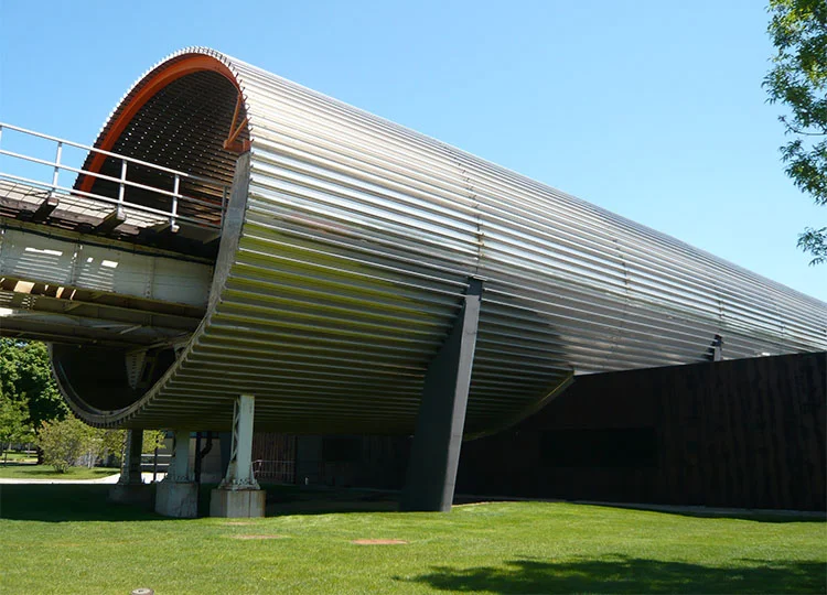 This building zigs and zags, and wraps the elevated metro line in a shimmering metallic skin.