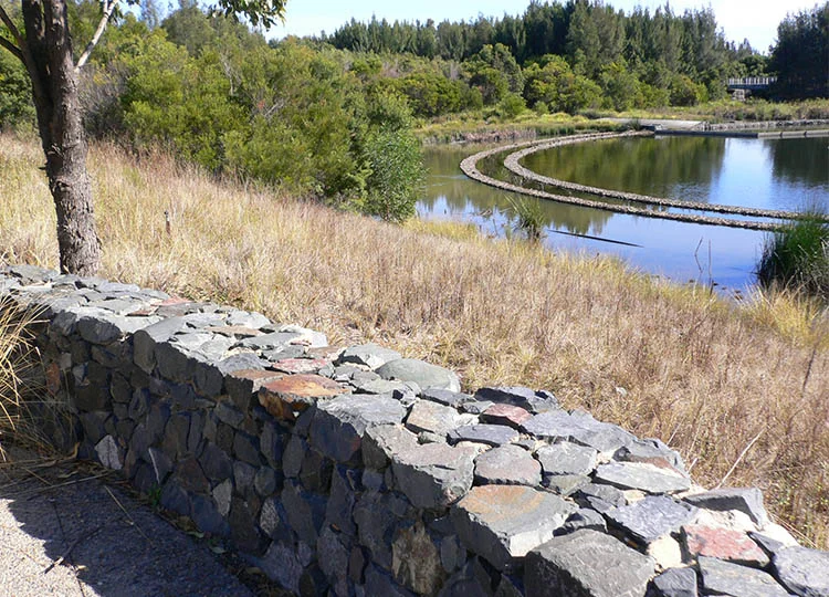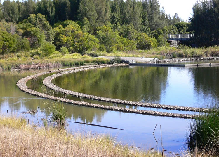 Barely a stone’s throw away the gabions have emerged from the water and started reaching skyward.