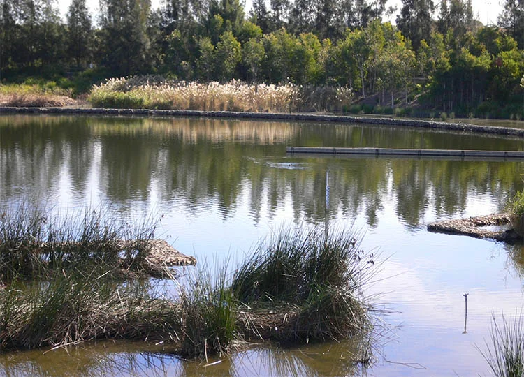 The wall appears to mark the change of depth of the wetland, with planting contained in the shallower water between (it's been chopped back in these images), and clear deep water out in the main body of the wetland.