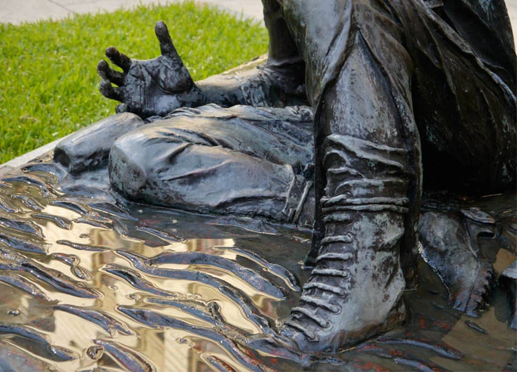 The soldiers in the Vietnam Memorial have also suffered. One slumps, injured, his boots sinking into the mud, as his comrade guides down a rescue helicopter. After a shower of rain the water pooling on the bronze seems to transform it back into a sticky, viscous mess.