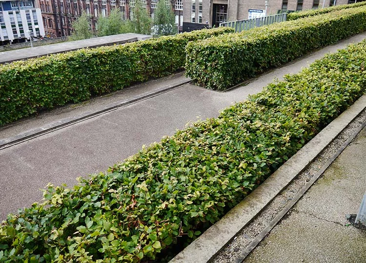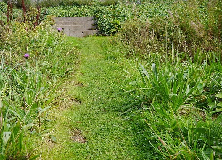 Contrasting bands of clipped hedges bring things back into order.