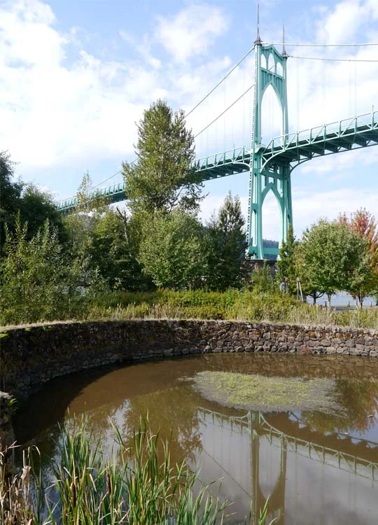 From there you’re taken on a journey around the pond, through well established planting that at times screens out views of the pond, the building, and even the St Johns Bridge.